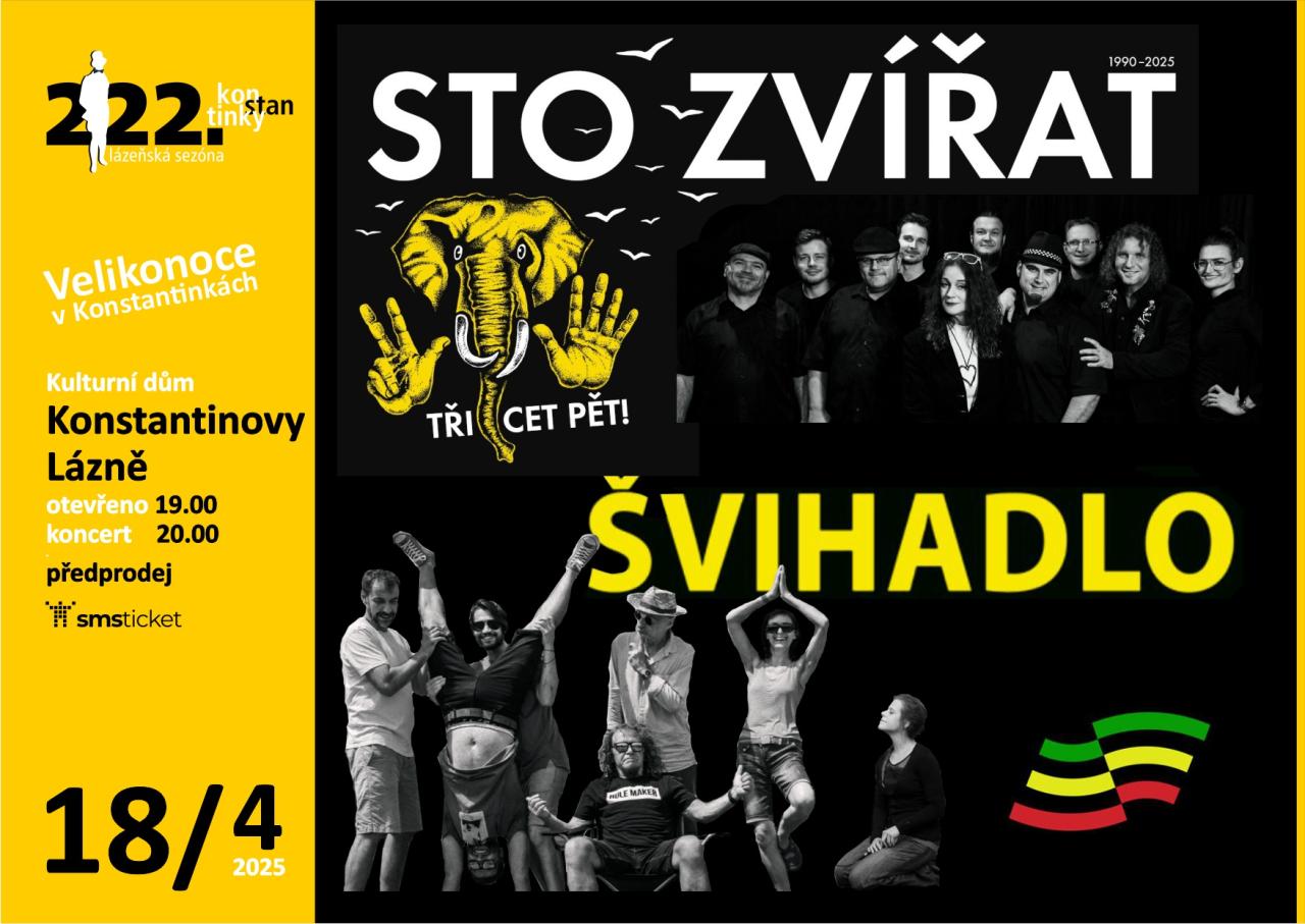 Připravte se na jízdu plnou rytmů a energie! Do Konstantinek přijíždí společná smršť spřátelených kapel Sto zvířat a Švihadlo, aby vám zpříjemnila start Velikonoc a naladili vás na pořádnou taneční vlnu!